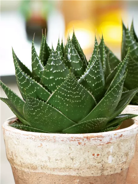 Die über 300 Arten der Aloe (Aloe) haben sich darauf spezialisiert, auch bei extremen Klimabedingungen zu überleben. Gießen Sie die Pflanze sehr sparsam, der Boden darf auch leicht austrocknen. An einem warmen und sonnigen Standort, auch mit direkter Sonneneinstrahlung, kommt die Pflanze gut zurecht und darf im Sommer gerne auf Ihren Balkon oder die Terrasse umziehen.