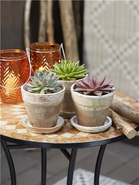 Die unkomplizierten Echeverien (Echeveria) werden auch Fettpflanzen genannt und imponieren durch ihre natürliche Vielfalt. Diese pflegeleichte Sukkulente mag einen sonnigen oder halbschattigen Standort und kann im Sommer auch gerne nach draußen ziehen. Sie benötigt nur sehr wenig Wasser und passt mit ihrem Aussehen perfekt zu jedem Wohntrend.